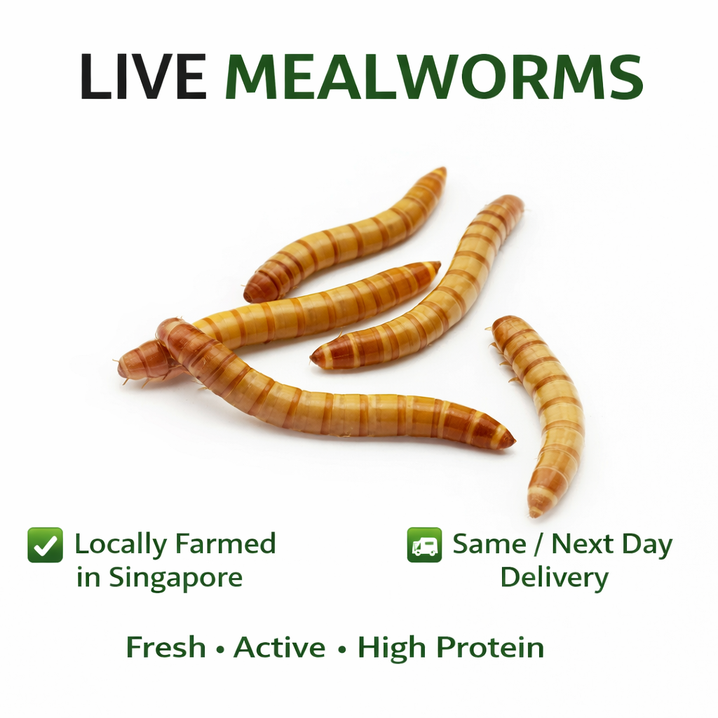 Mealworms are a natural high-protein insect feed, rich in protein, fat, and trace minerals. They are ideal for birds, reptiles, fish, and small pets. Our mealworms are farmed locally in Singapore under strict NParks regulations, ensuring top-quality and safe feed.
